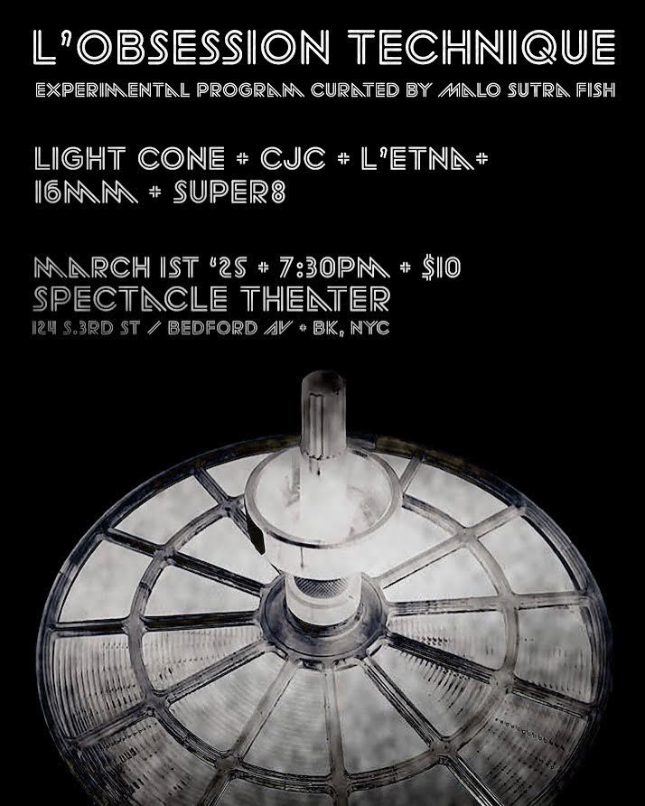 L’Obsession Technique is a selection of works curated by MaLo Sutra Fish taken mostly from Light Cone and CJC catalogues, two major landmarks of the Parisian Experimental Scene. It is the extended version of a program shown at Emerson College, Boston, centered either around personal technical obsessions or presenting major film collectives, core subjects of MaLo Sutra Fish’s practice. Showcasing filmmakers from L’Etna and L’Abominable, with a special tribute to the Australian NanoLab, the common thread is the exploration of the technical play as an illustration of memory.